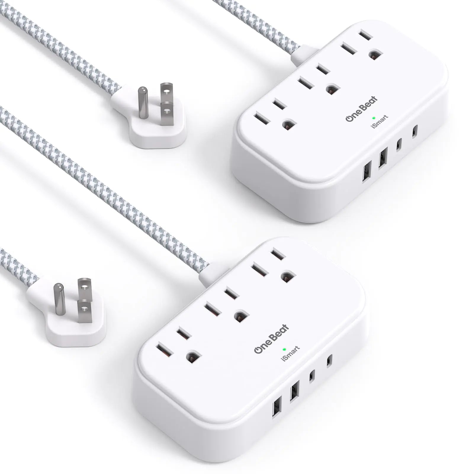 [【7 in 1 Travel Power Strip with USB Charge Port】The Flat Extension Cord could turn 1 sockets into 3 outlets 4 USB which could charge up to 7 devices at the same time. It could charge your cellphone laptop tablet cameras without a variety of converters save your space and make your desktop organize; With 4 anti-slip rubbers bottom the power strip can be stable on your desktop or nightstand without slipping off is suitable for home office and college dorm room 【Flat Plug Power Strip with 5ft Braided Cord】Our low profile powerstrip can fit behind dressers with 0.35” ultra thin flat wall plug design It’s also angled at 45 degrees to help avoid blocking adjoining outlets. Other than using it for travel must have this extension cord with multiple outlets can also be used in the home office guest room and camper van or as apartment essentials for first apartment college dorm room essentials. "【2 x USB C Power Strip】 One Beat USB charging station designed extra 2 USB type C ports so your USB-C cords dont need adapters the USB C port can charge up to 5V/3A. the 2 regular USB-A ports can charge up to 5V/2.4A Max all 4 USB Ports Output is 5V/3.1A 15.5W max which charging faster than other power strip." 【Cruise Ship & Dorm Room Essentials】Non Surge Protector Power plug is compact and lightweight the 4 rubber feet on the bottom keep from slipping and can be stable on the any table.NO surge protection it’s definitely a must have cruise ship accessories. Ideal for multiple devices charge together Whether as a desktop power strip or a nightstand charging station it can be competent. 【Multiple Safety Protection & After Service】RoHS ETL Certificates. This power strip has overload protection short-circuit protection over current protection over-voltage protection and overheating protection. Environmental protection and fire-resistance PC shell with flame retardant at 1382℉ makes it more durable and longer lifetime.(One Beat provides 12-month free worry. 24h customer service.)]