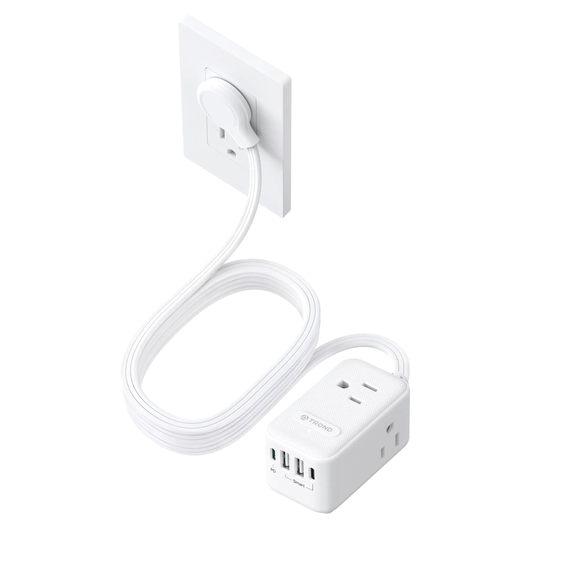 ["Space-Saving Flat Extension Cord: With a 0.33-inch ultra-thin flat head design this flat wall plug easily fits into tight spots and hides behind nightstands beds sofas dressers TVs and other furniture. The low-profile space-saving 45° angled flat plug ensures it doesnt block the bottom receptacle." 20W Fast USB-C Charging: Charge your phone quickly with the 20W USB-C 1 port. Featuring built-in intelligent charging technology it automatically detects and delivers the optimal charging speed for your device ensuring fast and safe charging. Cruise Essentials Must-Have: With a compact size of 3.07*1.73*1.57 inches this mini travel power strip easily fits into your luggage keeping you powered on any trip. It is designed without surge protection and is perfect for home and cruise ship use. The wide-range voltage design supports circuits from 120V to 240V making it an essential travel accessory. 7-in-1 Small Power Strip: This 3-sided flat plug power strip features 3 AC wide outlets and 4 USB ports (including 2 USB-C) allowing you to power up to 7 devices simultaneously. Its design accommodates large adapters without blocking adjacent outlets—maximum power: 1250W (125V~10A). Wall Mount Power Strip: The 10ft extension cord features a mounting hole design for secure installation in various locations including nightstands dressers couches and TVs. Four rubber bottoms prevent it from slipping off desktops tables and nightstands.]